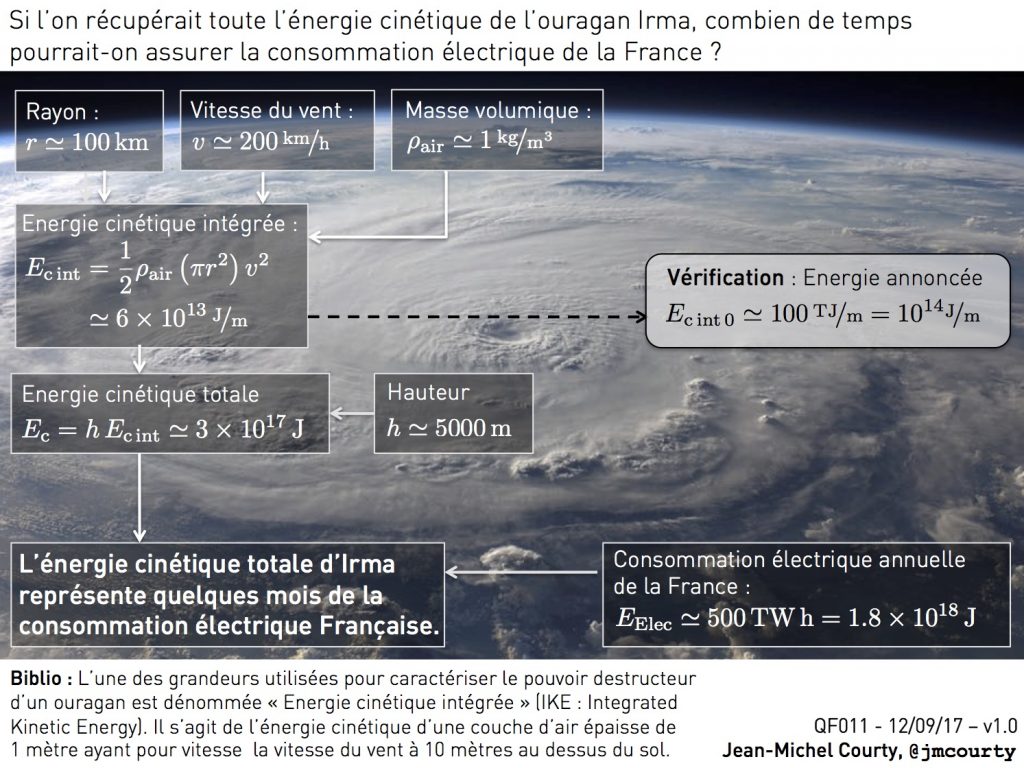 Ainsi, selon les hypothèses de calcul, on trouvera une énergie cinétique totale pour l’ouragan Irma comprise entre un mois et un an de consommation électrique de la France.
